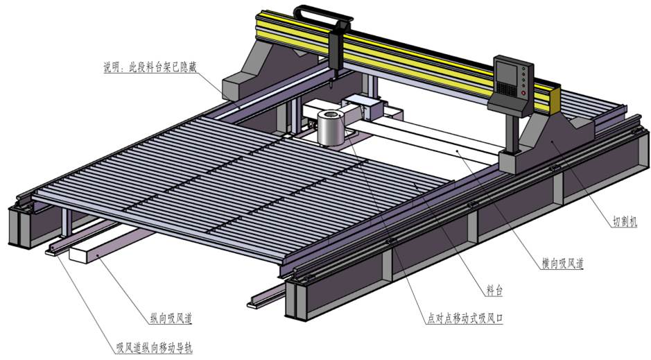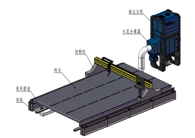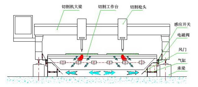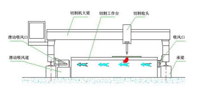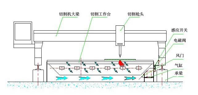 下吸式煙塵淨化係統抽風是通過下吸式抽風切割台來實現的,下吸式抽風切割台分成若幹個區域,每個區域設計有風門吸風,切割槍頭在每個區域切割時,相應區域的風門打開抽風,將91免费网站入囗的粉塵吸除。