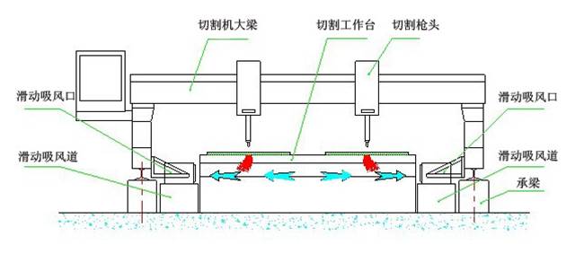 側吸式煙塵淨化係統采用吸風口固定在91免费网站入囗龍門架上,吸風口與吸風道之間通過密封皮帶密封,吸風口可隨龍門架在吸風道上來回移動吸風,將切割的粉塵吸除。